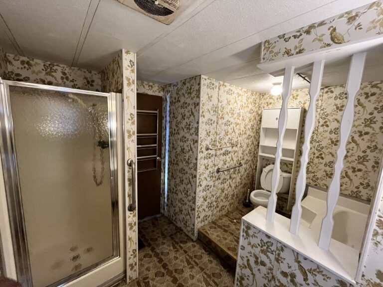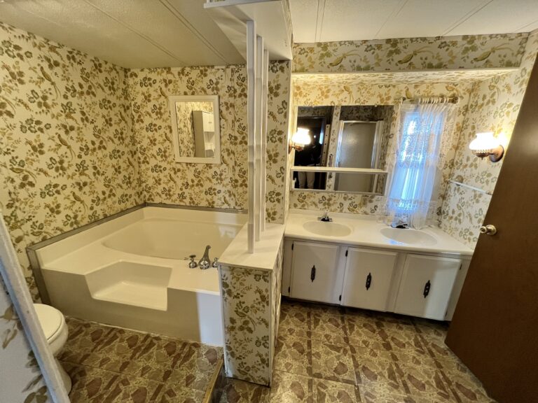 Though the home is not move-in ready, its generous floorplan includes a spacious kitchen and large main living area, providing an excellent foundation for a beautifully redesigned interior. One of the home’s standout features is a bathroom with dual access points—offering convenient entry from both the main suite and the rest of the home—and equipped with a large soaking tub and separate stand-up shower.